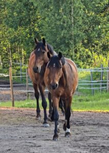 Naapuriponi Sessan ja Zara (takana) menossa yöksi laitumelle kesällä 2025. Sessan on lähes kuin miniversio Zarasta!