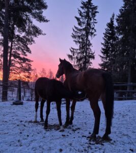 ”Täällä Liljååsilla arki rullaa pakkasista huolimatta. Kovemmilla pakkasilla hevoset viettävät lepopäivää ja tarhailevat lyhyemmän ajan. Talven haasteena on lumitöiden tuoma lisätyö joka vie pari-kolme tuntia päivästä, onneksi tämä talvi ei ole vielä ollut kovin runsasluminen.